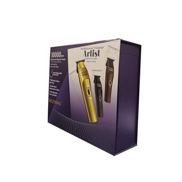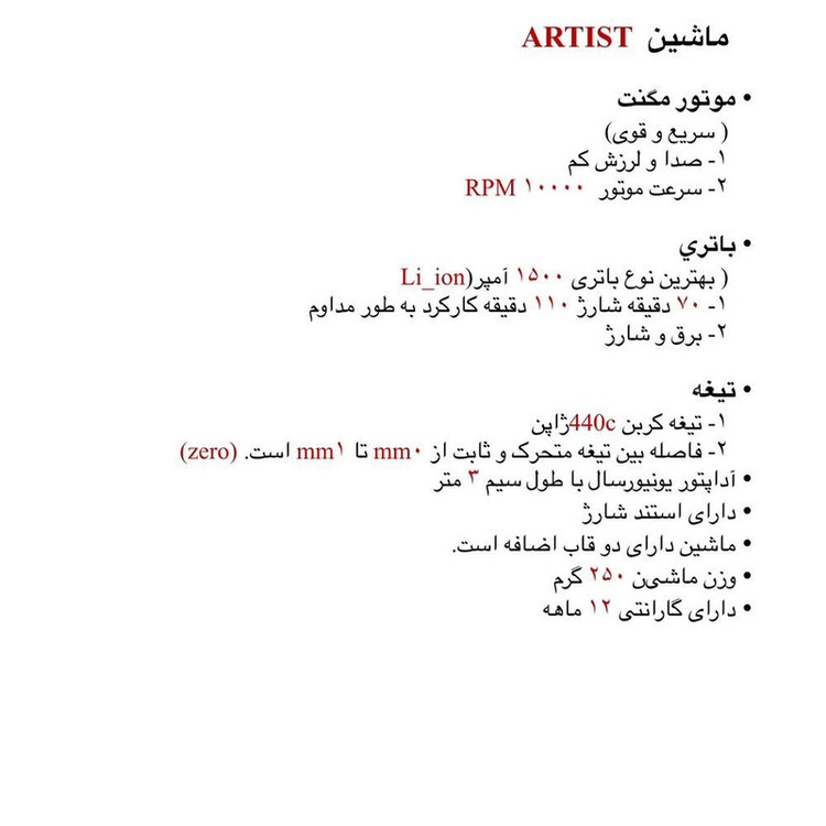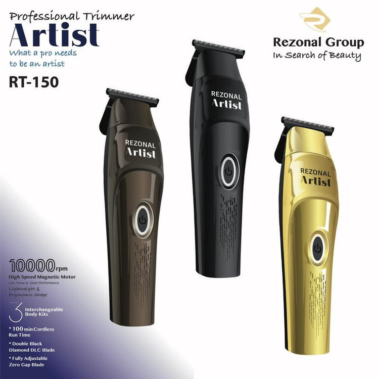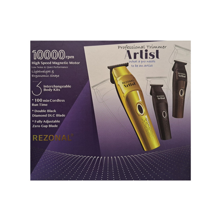 ماشین اصلاح خط زن رزونال آرتیست Rezonal artist دارای موتور قوی و پر سرعت با 10000دور دقیقه است که مگنتیک می باشد و صدا و لرزش کمی دارد و در هنگام استفاده به راحتی می توانید با خط زن رزونال آرتیست کار کنید و همانطور که از نام آن بر می آید ماشین مناسب برای کارهای حرفه ای و ظریف است که هنرنمایی شما را به بهترین شکل نشان می دهد. منبع تغذیه ماشین اصلاح خط زن رزونال آرتیست باتری شارژی 1500 میلی آمپر و برق شهری است که با شارژ 70 دقیقه ای کامل دستگاه تا 110 دقیقه اجرا ارائه می دهد و مجهز به آداپتور یونیورسال با سیم 3 متری است . جنس تیغه ها از استیل کربن بالای 440 ژاپنی است و فاصله ی بین تیغه متحرک و ثابت از 0 تا 1 میلیمتر است. همچنین خط زن رزونال ارتیست دارای دو قاب اضافه است و وزن دستگاه 250 گرم می باشد که به خاطر وزن کم بسیار راحت می توانید با آن کار کنید.