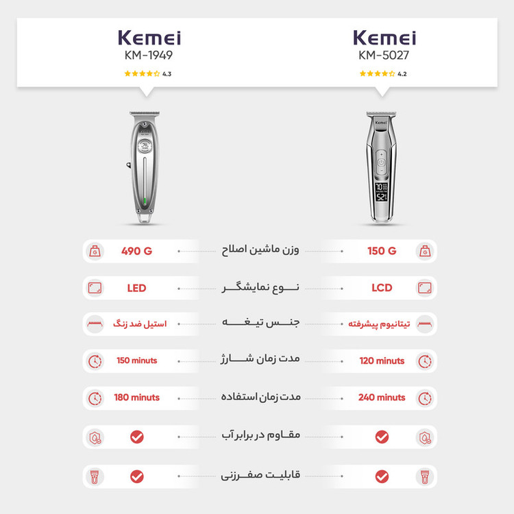 داشتن ماشیناصلاح ساده و جمعوجور که دارای طراحی ارگونومیک بوده و دست را اذیت نکند، از واجبات است. ماشین اصلاح کیمی مدل KM-5027، یکی از جدیدترین محصولات برند کیمی است که با ویژگیها و کیفیت خوبی که دارد، توانسته است به سرعت جای خود را میان مردم و آرایشگران باز کند. این مدل ماشین اصلاح را میتوان یکی از خوشدستترین و مدرنترین ماشین اصلاحهای موجود در بازار دانست که توانسته به واسطه تیغههای از جنس تیتانیوم پیشرفته و قابلیت صفرزنی خود شهرت بسیاری کسب کند. این دستگاه به همراه 3 شانه ارائه میشود و میتوانید با آن اصلاح از شماره 0 تا 3 را داشته باشید. یکی از قابلیتهای مهم این ماشین اصلاح، ویژگی خطزنی است که برای خط انداختن ریش، شقیقهها و پشت گردن کاربرد دارد. این دستگاه با 2 ساعت شارژ، فول شارژ شده و میتوانید 240 دقیقه بدون سیم از آن استفاده کنید. این ماشین اصلاح کم صدا و پرقدرت، هم برای اصلاح در خانه و هم برای سالنهای آرایشگاهی مناسب است. درصد شارژ دستگاه به صورت نمایش عددی LCD است و شما میتوانید به وسیله باتری قابل شارژ آن را شارژ کنید. کیمی مدل km-5027، تنها 150 گرم وزن دارد و دست را در استفاده طولانی خسته نمیکند. کیمی KM-5027 در برابر رطوبت مقاوم بوده و سری آن قابل شستوشو است. اما باید توجه داشته باشید که این دستگاه ضد آب نیست و نباید از آن زیر دوش استفاده کرد. به همراه این ماشین اصلاح 3 عدد شانه، آداپتور برق، برس تمیز کننده، کابل USB و روغن در بستهبندی قرار دارند.