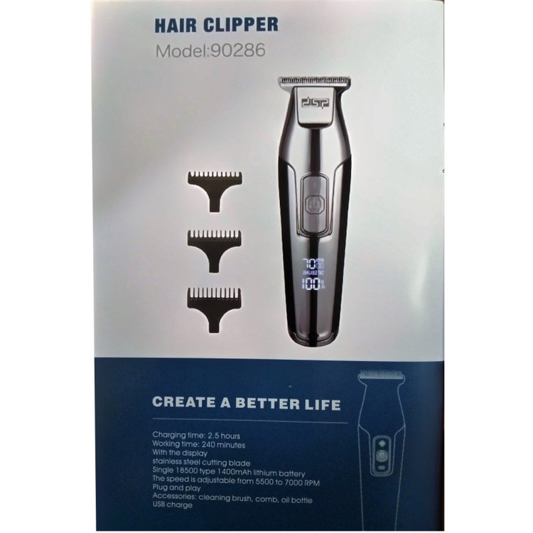ماشین اصلاح مدل 90286 از شرکت نوآور DSP یکی از قوی ترین ماشین هایی است که کمتر شبیه آن را خواهید دید. موتور با توان بالای 5 وات با جریان 60 هرتز و 7000 دور بر دقیقه دلیل این ادعا است. به کمک کلید های کم و زیاد روی بدنه میتوان سرعت چرخش و اصلاح را از 5500 تا 7000 دور تغییر داد. از دیگر خصوصیت های این دستگاه باتری لیتیمی و قابلیت نگهداری شارژ به مدت 240 دقیقه (4ساعت) و کار به صورت مداوم و پیوسته به مدت 4 ساعت و نیز قابلیت پشتیبانی شارژ سریع و همچنین شارژ با کابل USB است. آنچه بر روی بدنه این دستگاه خواهید دید: کلید خاموش و روشن، کلید های افزایش و کاهش سرعت اصلاح و میزان شارژ است. شما میتوانید با کابل USB ماشین را با لپ تاپ و حتی پاور بانک خود شارژ کنید.