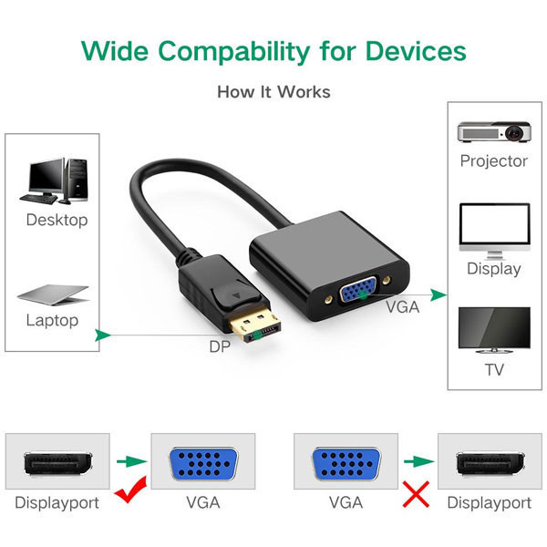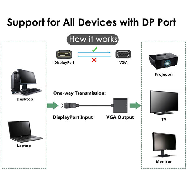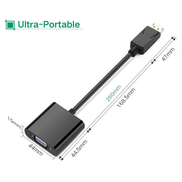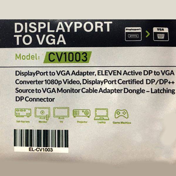 تبدیل Display Port به VGA برند ایلون مدل CV1003 برای انتقال تصویر از دستگاه با خروجی Display مانند کارت گرافیک به مانیتور و یا تلویزیون دارای ورودی VGA مورد استفاده قرار می گیرد. کانکتور ویدیویی جدیدی است که بر روی ابزارهای مدرن تر و جدید تر خصوصا لپتاپ ها ارائه میشود و هدف از طراحی و ارائه اش در تبدیل Display Port به VGA برند ELEVEN مدل CV1003 تکرار موفقیت DVI و HDMI بر روی کامپیوترها است، اما میتوان گفت هنوز به اندازه DVI و HDMI پذیرفته نشده است. هر چند ناگفته نماند این پورت بر روی مک های جدید و تعداد زیادی از کامپیوترهای Dell ، HP و Lenovo در حال عرضه شدن است و عملکردش نیز بسیار شبیه HDMI است محتوای تصویری و صوتی HD بر روی یک کابل واحد منتقل میشود و رزولوشن خروجی آن 1080x 1920 به همراه 8 کانال صوتی است. این تبدیل در حالت برعکس یعنی اگر خروجی گرافیک VGA و مانیتور Display باشد کاربردی ندارد. برای این منظور باید از تبدیل VGA به Display Port تهیه نمایید.