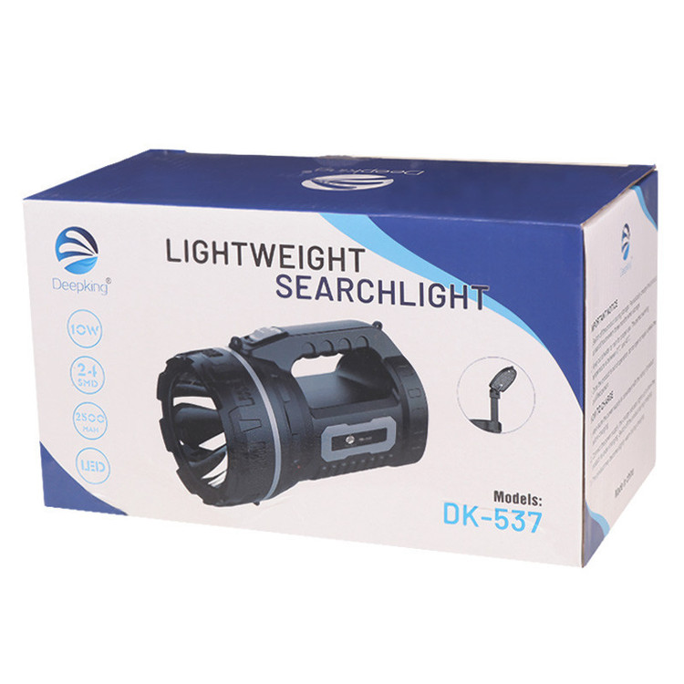 چراغ قوه شارژی دیپ کینگ مدل DK-537 مقدار ولتاژ کاری 220 تا 240 ولت و فرکانس ورودی 50 الی 60 هرتز متریال ساخت بدنه از جنس پلاستیک مقاوم در برابر فشار و ضربه، دارای نشانگر LED مجهز به یک عدد چراغ LED اصلی و 24 چراغ SMD جانبی با نوردهی مهتابی و توان خروجی 10 وات دارای کلید فیزیکی جهت روشن/خاموش کردن و سوئیچ بین چراغ ها، دسته و بند همراه جهت حمل و نقل آسان مدت زمان شارژ شدن 12 ساعت و میزان شارژدهی حدود 6 ساعت برای چراغ اصلی و 8 ساعت برای چراغ جانبی تامین انرژی از طریق باتری داخلی از نوع Lead-Acid با ظرفیت 2500 میلی آمپر ساعت، قابلیت شارژ مجدد به وسیله اتصال به برق شهری است