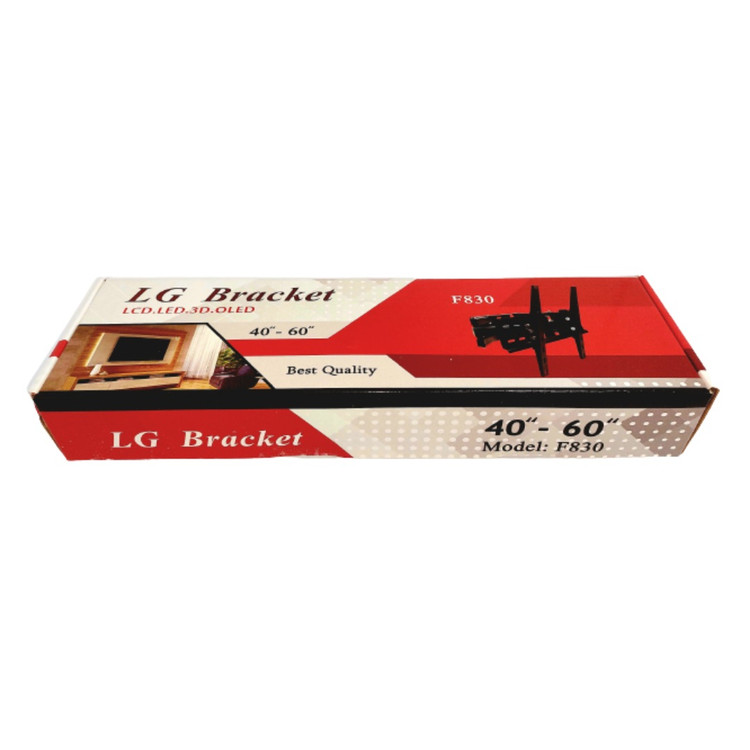 پایه دیواری تلویزیون ال جی مدل F830 تولید داخلی با استانداردVESA که با ضخامت ورق 1.5 میلی متر با استفاده از برش لیزری با کیفیت میباشد که به شما اجازه می دهد تلویزیون خود را در تمامی جهات که دوست دارید حرکت داده و در زاویه مناسب و دلخواه قرار دهید ( قابلیت تغییر زاویه و تغییر فاصله از دیوار را دارد 15 درجه به بالا و پایین 45 درجه به چپ و راست 40 سانتیمتر به جلو و عقب ) و کمترین فاصله پشت تلویزیون از دیوار 15 سانتی متر می باشد. پایه نگهدارنده تلویزیون F830 از جنس فلز ساخته شده است. پایه دیواری تلویزیون ال جی مدل F830 با رنگ الکترواستاتیک کوره ای پوشانده شده که مقاومت آن را چند برابر می کند.این پایه دیواری تلویزیون با وزن 4000 گرم قادر به نگهداری وزنی بالغ بر 40 کیلوگرم است. این پایه تلویزیون برای تلویزیون های با سایز 40 تا 60 اینچ طراحی و ساخته شده است. براکت دیواری F830 بهترین گزینه برای تلویزیون سامسونگ، ال جی، سونی، شارپ، ایسوس، اسنوا، فیلیپس، پاناسونیک و ایکس ویژن می باشد. روش نصب براکت تلویزیون بسیار آسان و ساده می باشد. در اکثر مدل های پایه دیواری تلویزیون راهنما و تجهیزات نصب وجود دارد. کاربران می توانند راهنمای نصب پایه تلویزیون را مطالعه کنند. و با استفاده از ابزارهای ساده مانند دریل و مته و پیچ گوشتی پایه را روی دیوار نصب کنند. سپس تلویزیون را روی پای قرار دهند. بهتر است پس از نصب پایه و زمان قرار دادن تلویزیون روی پایه، با توجه به سنگین بودن تلویزیون از شخص دیگری نیز کمک گرفت. البته قبل از نصب پایه تلویزیون F830 ابتدا باید از قدرت و مقاومت دیوار اطمینان حاصل کرد. دیوار محل نصب بایستی قدرت تحمل پایه به همراه تلویزیون را داشته باشد. اگر چنین نبود باید محل مناسب دیگری برای نصب پیدا کرد و یا دیوار فعلی را با کمک افراد متخصص تقویت کرد.پایه دیواری تلویزیون ال جی مدل F830 ، تمامی وسایل و یراق آلات مورد نیاز نصب درون بسته بندی قرار دارد و حداکثر وزن مجاز 40 کیلوگرم می باشد. و کمترین فاصله پشت تلویزیون از دیوار 15 سانتی متر می باشد. بیشترین فاصله تلویزیون از دیوار زمانی که بازوهای جک به طور کامل باز است 40 سانتی متر می باشد.