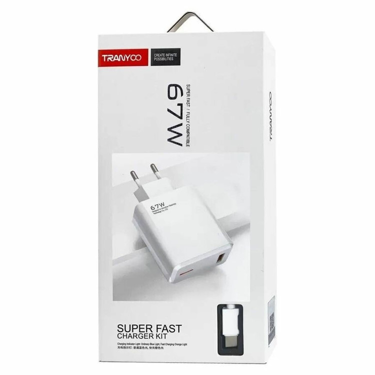 شارژر دیواری تایپ سی 67 وات ترانیو مدل EU2-C جنس بدنه ABS+PC است که باعث بازدارندگی شعله و آتش می شود ورودی 110-240 ولت تا 50/60 هرتز 1.8AMax خروجی: 4.5V/5A 5V=3A 9V=2.5A 12V/1.88A پشتیبانی: QC2.0/3.0/4.0 پشتیبانی از تمامی مدل های گوشی های هوشمند اعم از برند های Samsung AFC,Xiaomi,Huawei FCP/SCP, OPPO VOOC,VIVO شارژر سریع دو موتوره و شارژ فوق سریع و توربو شارژ کاملاً سازگار گوشی های شیائومی. نمایش چراغ چرخش شارژ سریع هنگامی که شارژ سریع انجام می شود چراغ تعبیه شده رویشارژر دیواری تایپ سی 67 وات ترانیو مدل EU2-C نارنجی می شود به جرعت می توان گفت یکی از با کیفیت ترین اداپتور های 67 واتی بازار می باشد که برند ترانیو به تازگی تولید کرده است.