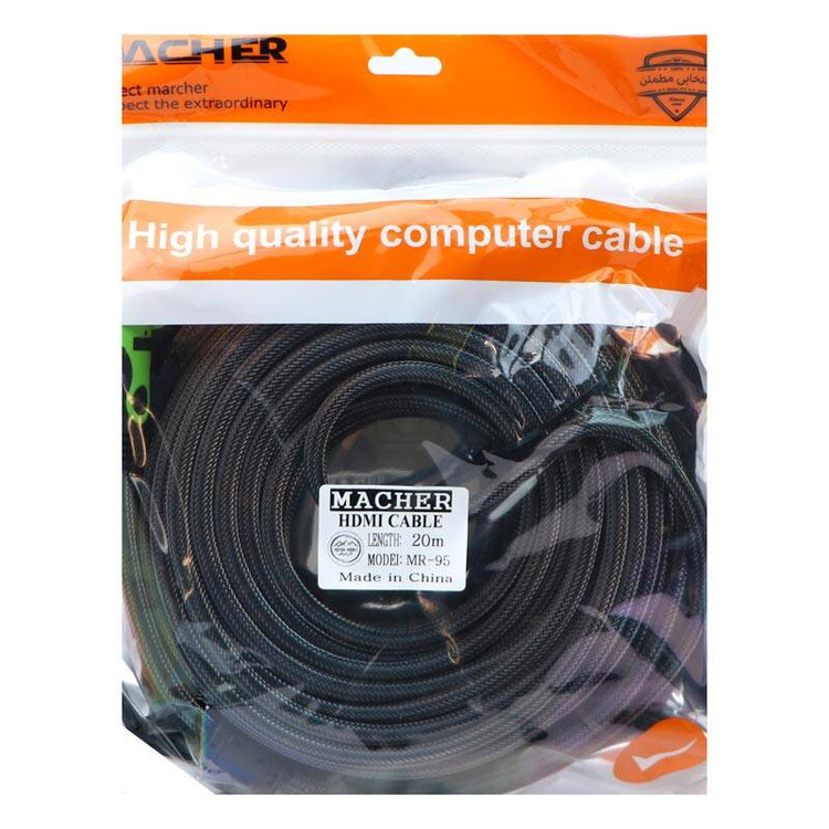 با بالارفتن کیفیت پخش در نمایشگر ها کابل های HDMI تقریبا به یکی از مهم ترین رابط ها برای انتقال تصویر و صدا تبدیل شده اند، این کابل ها به دلیل امکان انتقال همزمان صدا و تصویر با بالاترین کیفیت طرفداران زیادی داشته و تقریبا در هر نمایشگر امروزی قابل استفاده اند. کابل Macher MR-95 یک کابل خوش ساخت و با کیفیت است که می تواند تمامی نیاز های روزمره افراد را در زمینه های مختلف برطرف کند. این کابل طولی 20 متری دارد تا برای انتقال تصویر بین نمایشگر ها ازادی عمل کافی داشته باشید، روکش این کابل نیز از نایلون بافته شده پوشیده شده تا در برابر گره خوردگی و پارگی مقاومت داشته باشد، همچنین وجود یک لایه محافظ بر روی کانکتور ها از آن ها در برابر فشار و ضربه محافظت می کند.