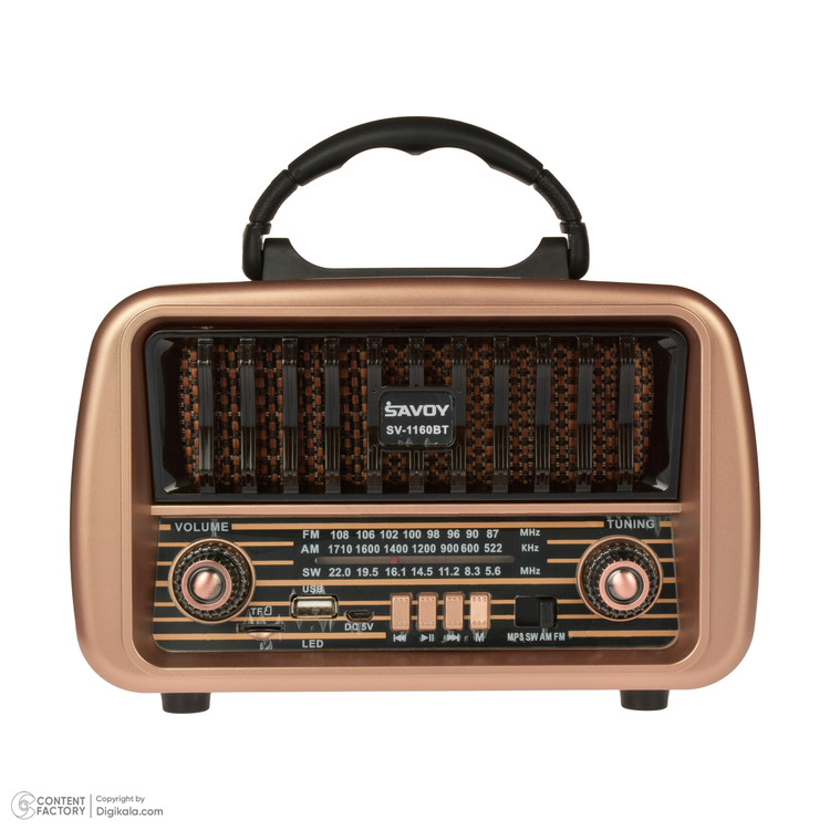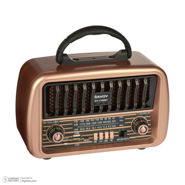 در دنیایی که همه چیز به سرعت در حال تغییر است، برخوردن به یک قطعه هنری که تلفیقی از گذشته و آینده باشد، میتواند بسیار هیجان انگیز باشد. رادیو (SAVOY)ساووی مدل SV1170BT، یک شاهکار بیزمان است که زیبایی کلاسیک و قابلیتهای مدرن را در کنار هم ارائه میدهد.این رادیو طرح قدیم با ظاهری کلاسیک و شیک، نه تنها یک وسیله پخش صوت است، بلکه یک قطعه هنری است که میتواند هر فضایی را زیباتر کند. اما تنها زیبایی ظاهری آن نیست که این محصول را خاص میکند. رادیو ساووی مدل SV1170BT با قابلیتهای پیشرفتهای که دارد، تجربهای لذتبخش از گوش دادن به موسیقی را برای شما به ارمغان میآورد.این دستگاه با پشتیبانی از سه موج رادیویی AM، FM، و SW، به شما امکان میدهد تا از گوش دادن به ایستگاههای رادیویی مورد علاقهتان در هر کجا که هستید لذت ببرید. ویژگی دارای بلوتوث آن این امکان را میدهد که به راحتی به دستگاههای دیگر متصل شوید و به موسیقی مورد علاقه خود از طریق پخش MP3 از فلش و مموری کارت گوش دهید. علاوه بر این، رادیو(savoy) ساووی مدل SV1170BT دارای درگاه USB و TF است، که امکان پخش مستقیم موسیقی از فلش مموری یا کارت حافظه را فراهم میآورد. و نگرانی از بابت تمام شدن شارژ دستگاه نداشته باشید؛ زیرا با باتری شارژی ۱۲۰۰ میلی آمپر ساعتی که دارد، میتوانید ساعتها از گوش دادن به موسیقی یا اخبار بدون نگرانی از قطع شدن برق لذت ببرید.رادیو ساووی مدل SV1170BT نه تنها یک وسیله پخش است، بلکه یک رفیق قابل اعتماد برای دورهمیهای خانوادگی، مهمانیها، و یا حتی لحظات تنهایی شماست. این دستگاه، با تلفیق بینظیری از طراحی کلاسیک و قابلیتهای مدرن، تجربهای خاص از گوش دادن به موسیقی را برای شما رقم میزند.پس اگر به دنبال یک هدیه خاص برای عزیزانتان هستید یا میخواهید فضای خانه یا محل کارتان را با یک قطعه هنری شیک و کاربردی زیبا کنید، رادیو ساووی مدل SV1170BT انتخابی ایدهآل است. اجازه دهید موسیقی شما را به دنیایی دیگر ببرد و با این رادیو طرح قدیم، هر روزتان را به یادماندنی کنید.