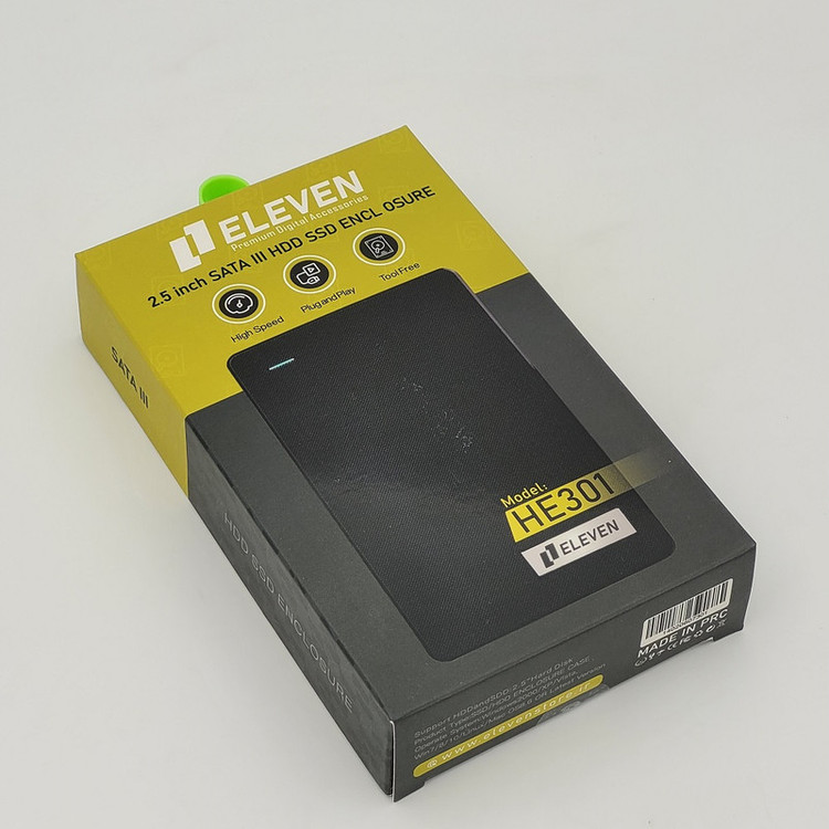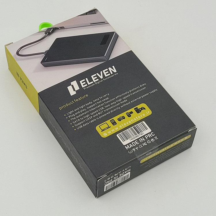 باکس هارد اکسترنال 2.5 اینچ ELEVEN مدل HE301 محصولی از برند ELEVEN بوده که در ابعاد 2٫5 اینچی تولید شده است. در ساخت قاب این باکس از متریالی استفاده شده که در برابر ضربه دیدن مقاومت مطلوبی داشته و در عین حال دمای آن هنگام کار کردن به میزان زیادی بالا نخواهد رفت.ضمنا باز کردن درب باکس بصورت کشویی بوده و بدون احتیاج به هیچ گونه ابزار و پیچ گوشتی براحتی باز شده و پس از قرار دادن هارد دیسک در آن توسط رابط USB 3.0 به سیستم متصل خواهد شد و به انتقال اطلاعات می پردازد. مجهز بودن به نشانگری کوچک از نوع LED یکی دیگر از ویژگی های ELEVEN است که روشن بودن آن نشان از اتصال و کارکرد صحیح دستگاه دارد. همچنین کاربران به لطف پشتیبانی از اتصال Plug And Play جهت استفاده از قاب اکسترنال نیاز به نصب هیچ گونه درایور یا نرم افزار نخواهند داشت و کار کردن با آن کاملا آسان می باشد.