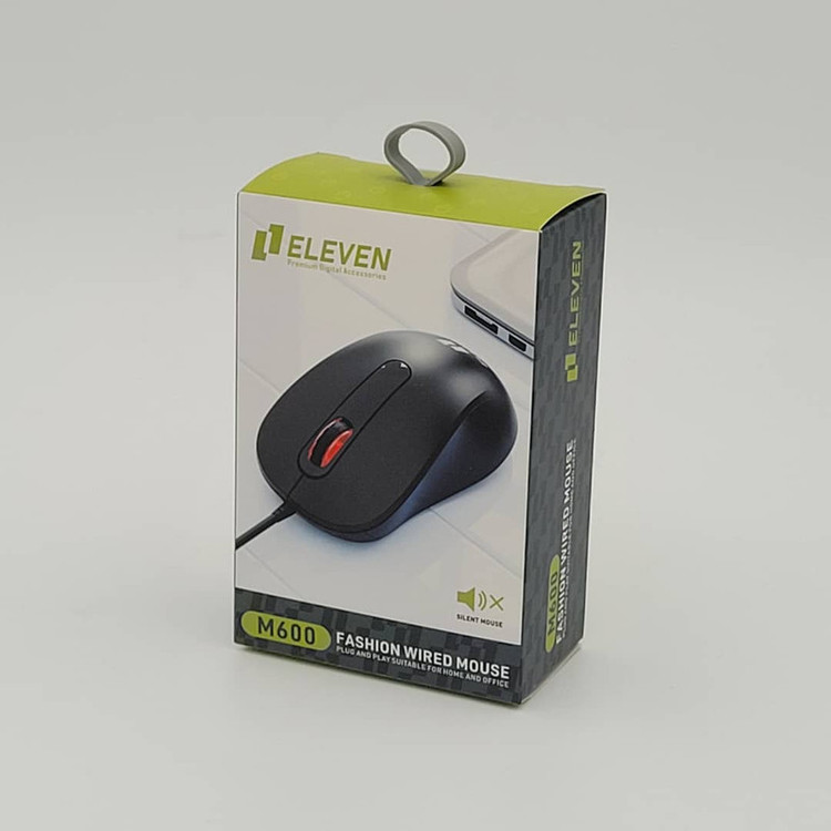 ماوس سیم دار ELEVEN مدل M600 دارای طراحی ارگونومیک جهت استفاده طولانی مدت از محصول می باشد.این موس دارای کلید های بی صدا میباشد که موقع کار با موس(کلیک)صدایی ایجاد نمیکند. جنس بدنه ماوس مدل M600 از پلاستیک ABS مقاوم در برابر فشار و ضربه می باشد.برای نگهداری بهتر از ماوس از آن بر روی سطوح ناهموار استفاده نکنید و درصورت نیاز از پد ماوس استفاده کنید.از ویژگی های این ماوس اسکرول بدون نویز و حسگر اپتیکال با کیفیت آن است.ماوس مدل M600 شرکت ایلون با استفاده از یک کابل USB با روکش از جنس TPE مقاوم در برابر کشش و پارگی به سیستم شما متصل میشود و مجهز به حسگر اپتیکال با میزان دقت 1000DPI است.. عمرکاری سوئیچ این محصول بسیار بالا و تا 2 میلیون بار است. ماوس سیم دار ELEVEN مدل M600 با طراحی زیبا و با کیفیت خود یک محصول اقتصادی در میان رقبای خود می باشد.