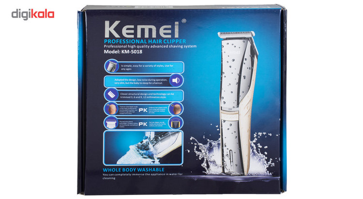 ماشین اصلاح «کیمی» مدل «KM-5018» دستگاهی برای اصلاح موهای سر و صورت مجهز به باتری قابلشارژ و کاملا ضد اب است. سر اصلاح ماشین به شکل تریمر بوده که از دو تیغهی فلزی لغزان روی یکدیگر تشکیل شده است. فاصلهی بین این دو تیغه، طول اصلاح را تعیین میکند. طول اصلاح تیغه ثابت و برابر 0.5 میلیمتر است. وزن آن 160 گرم است. برای اینکه بتوان موهای صورت را در اندازههای بیشتر از 0.5 میلیمتر کوتاه کرد، میتوان از شانهی ارائهشده همراه دستگاه استفاده کرد. انرژی ریشتراش کیمی از باتری قابلشارژ آن تأمین میشود. مدتزمان شارژ کامل باتری 8ساعت و زمان شارژدهی آن 50 دقیقه است. میتوان زیر دوش از دستگاه استفتده کرد. برای افزایش عمر تیغهها بهتر است پس از هر بار استفاده، خردههای مو را توسط برس تمیز کرده و توسط روغن موجود در جعبه، تیغهها را روغنکاری کنید. بهطور خلاصه ریشتراش KEMEI KM-5018دارای تیغهی تریمر با عرض 25 میلیمتر، طول اصلاح 0.5 میلیمتر، باتری قابلشارژ 4شانه سایزهای 3-6-9-12 بوده و برای اصلاح موهای سر و صورت مناسب است