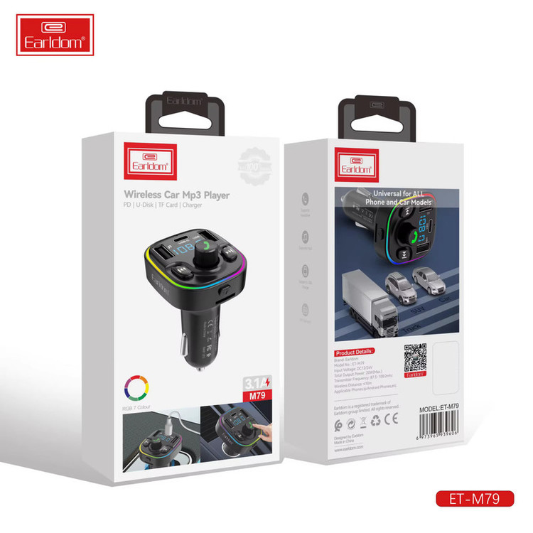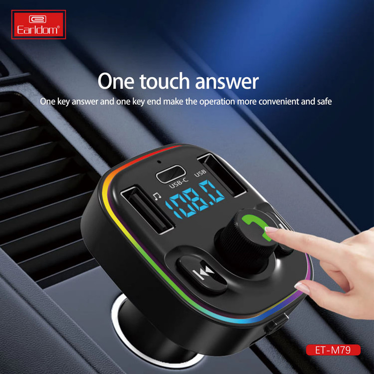 شارژر فندکی + FM Player بلوتوثی Earldom ET-M79 پخش کننده اف ام پلیر بلوتوثی ارلدام مدل ET-M79 برخورداری از دو عدد درگاه USB با میزان شدت جریان خروجی 3.1 آمپر و 1 آمپر در ولتاژ 5 ولت برای یک پورت و درگاه دیگر به منظور اتصال فلش مموری دارای دو پورت خروجی Type-C و USB، خروجی تایپ سی با پشتیبانی از شارژ سریع، مجهز به نورپردازی با ایجاد جلوه ی بصری زیبا در نور کم و تاریکی امکان دریافت امواج رادیو FM در بازه ی فرکانسی 87٫5 الی 108 مگاهرتز، دارای چندین کلید فیزیکی جهت مدیریت موسیقی در حال پخش، تماس و ... فرکانس بی سیم بلوتوث 2٫402 الی 2٫480 گیگاهرتز، با پشتیبانی از پروفایل بلوتوث A2DP به منظور اتصال آسان به سایر دستگاه های بلوتوثی متریال ساخت بدنه از پلاستیک ABS مقاوم در برابر ضربه و فشار و آسیب احتمالی، دارنده استاندارد های ایمنی و سلامت شامل CE نحوه ی اتصال به صورت بی سیم توسط بلوتوث نسخه 5 با برد 5 متری، مجهز به نمایشگر LED میزان شدت جریان خروجی درگاه تایپ سی برابر با 3.1 آمپر در 5 ولت است