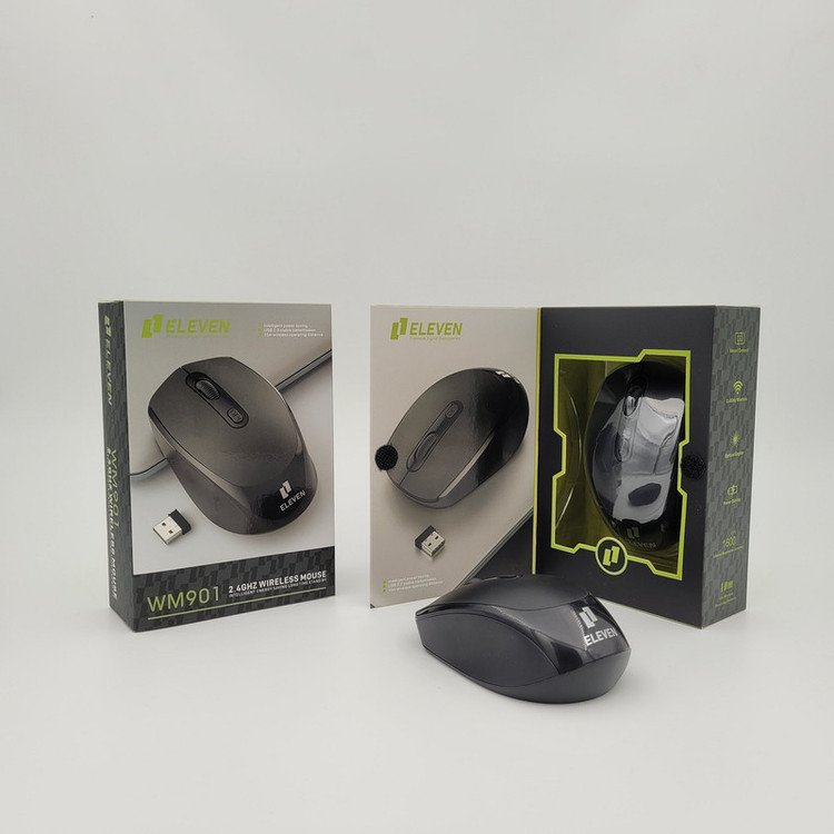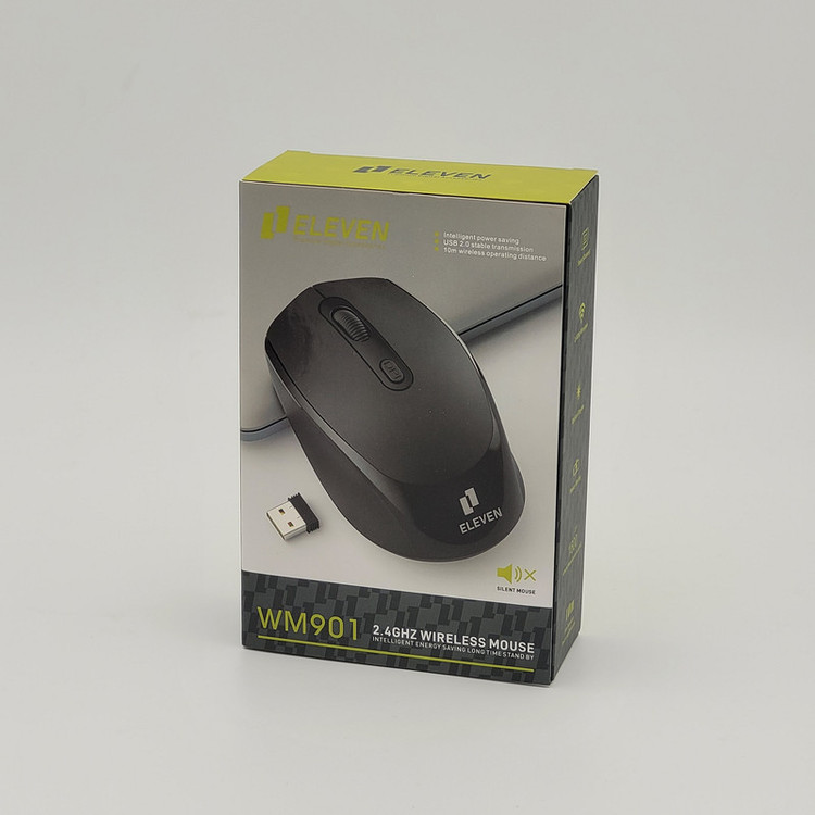ماوس بیسیم WM901 کمپانی ELEVEN یک ماوس بیسیم با کیفیت هستش و تکنولوژی کلید های سایلنت دارد. این ماوس 4 کلید بوده و از یک حسگر اپتیکال با دقت بالای 1600DPI بهره میبرد و بردی برابر 10 متر را پوشش میدهد. انرژی مورد نیاز ماوس بیسیم WM901 به وسیلهی یک عدد باتری قلمی سایز AA تامین میشود. این ماوس از اکثر نسخههای سیستم عامل ویندوز و مک پشتیبانی میکند و میتوان با خیال راحت، مدتها با آن کار کرد. ماوس WM901 دارای دکمه تغییر DPI بوده و میتوان با استفاده ار آن دقت ماوس را بین 1600-800 تغییر داد.