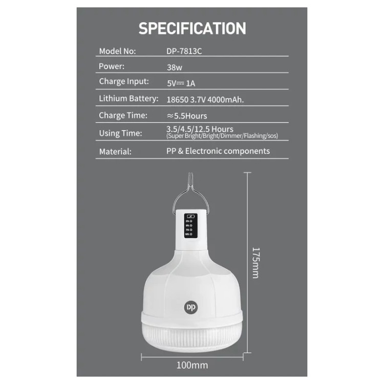 چراغ اضطراری شارژی دی پی مدل DP-7813C یک چراغ LED قابل حمل است که می توان از آن در مواقع اضطراری استفاده کرد. این چراغ دارای یک باتری با عمر طولانی است که می تواند تا 12 ساعت کار کند.