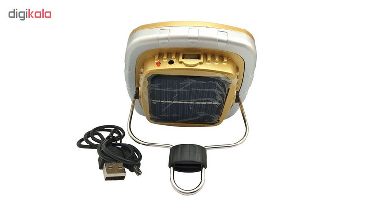 مجهز به پاوربانک (پورت USb) قابل شارژ با نور خورشید (صفحه خورشیدی در پشت) همراه با کابل شارژ برای شارژ برقی دارای لامپ 3 وات COB