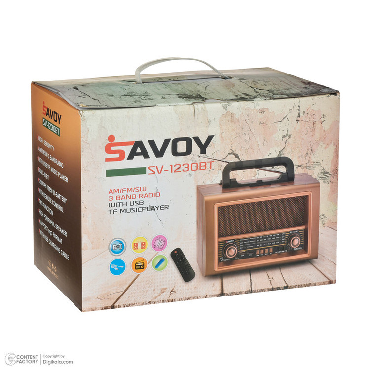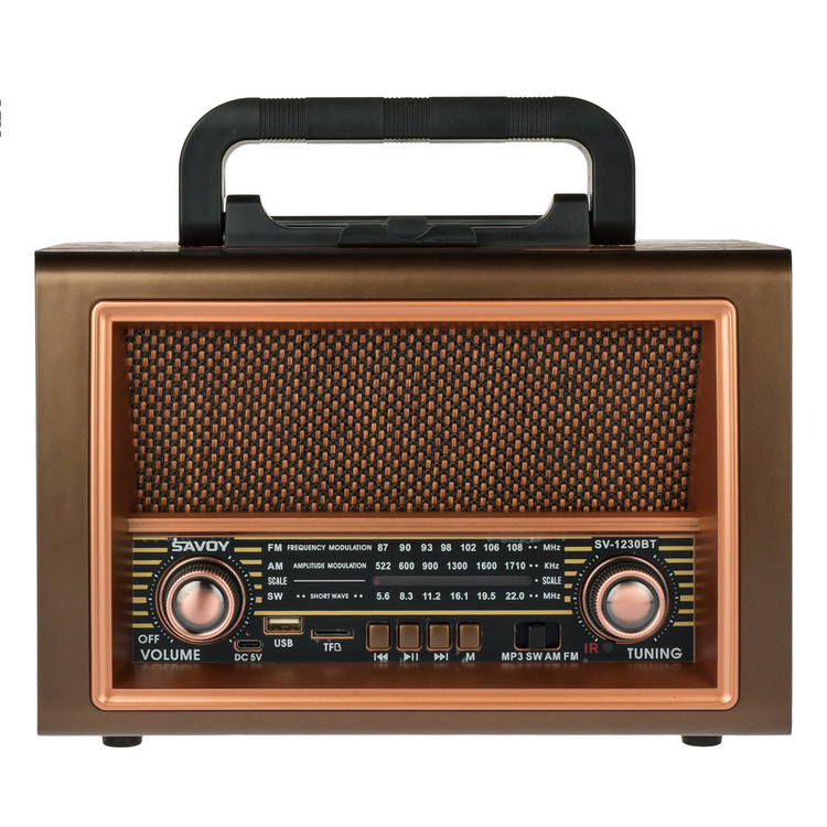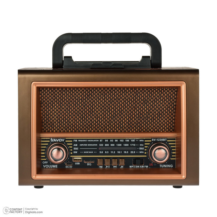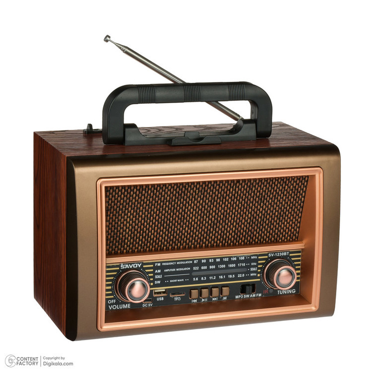 با رادیو کلاسیک ساووی مدل SV-1230BT، سفری به دنیای خاطرات و صدای گرم موسیقی را تجربه کنید. این محصول با طراحی ظاهری متمایز و الهام گرفته از رادیوهای طرح قدیم، نه تنها به عنوان یک وسیله پخش صوتی کاربردی، بلکه به عنوان یک قطعه هنری دکوراتیو در فضای منزل یا محل کار شما نیز عمل میکند. رادیو طرح قدیم SAVOY ساووی مدل SV-1230BT با پشتیبانی از سه موج رادیویی AM, FM, SW، امکان دسترسی به طیف گستردهای از ایستگاههای رادیویی را فراهم میکند. این امکان به شما اجازه میدهد تا از اخبار، برنامههای زنده و موسیقیهای مورد علاقه خود در هر زمان و هر مکانی لذت ببرید. علاوه بر این، رادیو ساووی مدل SV-1230BT با دارا بودن درگاههای USB و TF، امکان پخش موسیقی MP3 از طریق فلش و مموری کارت را به شما میدهد. همچنین، با قابلیت بلوتوث این دستگاه، میتوانید به راحتی موسیقی مورد علاقه خود را از گوشی هوشمند، تبلت یا هر دستگاه دیگری که بلوتوث دارد، بدون نیاز به سیم و اتصالات پیچیده، پخش کنید.یکی از ویژگیهای برجسته رادیو کلاسیک SAVOY مدل SV-1230BT، باتری شارژی قدرتمند ۱۲۰۰ میلی آمپری آن است که امکان استفاده طولانی مدت و بدون نگرانی از اتمام شارژ را فراهم میآورد. این ویژگی، رادیو را به یک همراه ایدهآل برای سفرها، پیکنیکها و فعالیتهای فضای باز تبدیل میکند.رادیوSAVOY مدل SV-1230BT، با ترکیبی از طراحی کلاسیک و امکانات مدرن، پاسخی به نیازهای روزمره شما در زمینه سرگرمی و اطلاعرسانی است. این محصول، با کیفیت صدای بینظیر و امکانات پیشرفته، تجربهای لذتبخش از شنیدن رادیو و موسیقی را برای شما به ارمغان میآورد. اگر به دنبال یک رادیو با کیفیت، دارای ویژگیهای مدرن و ظاهری خاص هستید، رادیو طرح قدیم ساووی مدل SV-1230BT انتخابی ایدهآل برای شما خواهد بود.