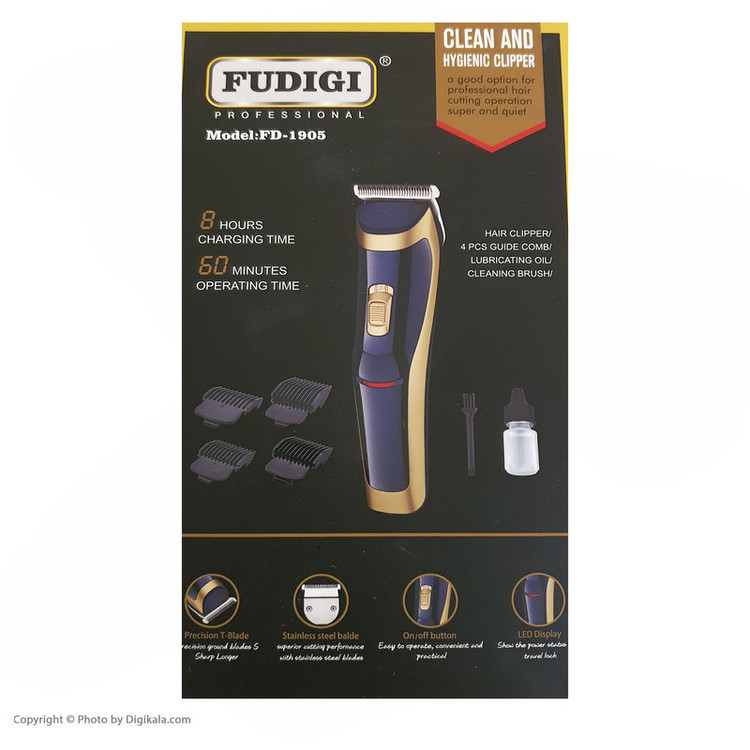 ماشین اصلاح سر و صورت فودیجی مدل FD-1905 ؛ دارای چهار شانه اصلاح ، روغن روان کننده ، برس پاکسازی ، آداپتور شارژ، دفترچه راهنما