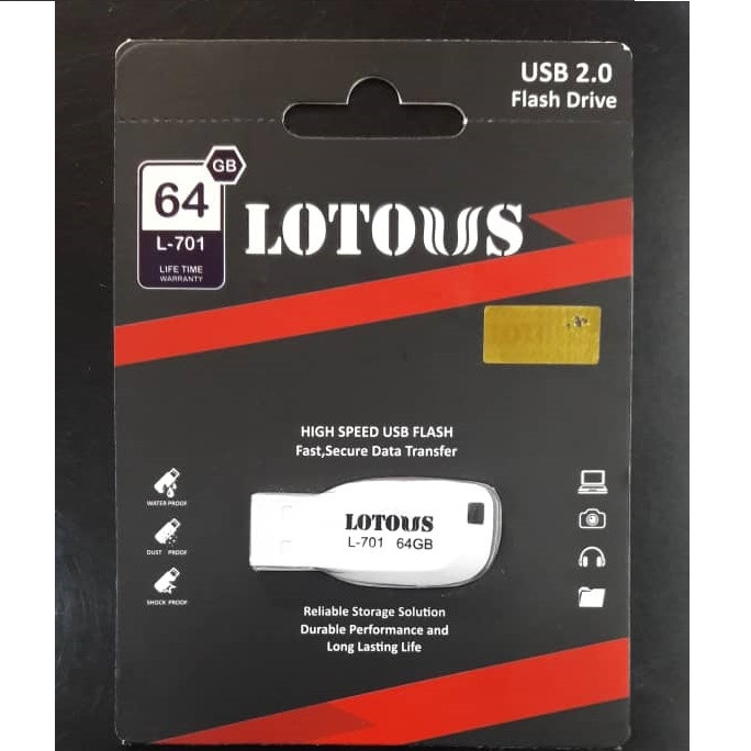 فلش مموری لوتوس مدل L701 با سیستم عاملهای ویندوز Windows 8.1, Windows 8, Windows 7, Windows Vista , Mac OS 9.0 and above, Linux 2.4 سازگار است. این ذخیرهکننده از سرعت خواندن 50 مگابایت برثانیه و سرعت نوشتن 20 مگابایت برثانیه برخوردار است و از تکنولوژی پشتیبانی از حالت صرفه جویی در انرژی بهره میبرد.فلش مموری لوتوس مدل L701 ظرفیت 64 گیگابایت علی الرغم استفاده از رابط USB 2 ،سرعت انتقال بالایی دارد که به میزان قابل توجهی عملکرد انتقال اطلاعات را بهبود داده است. همچنین این محصول با رابط USB 2.0 و USB 1.1 سازگار است. جنس بدنه این فلش مموری از فلز با روکش پلاستیک ABS می باشد. از مزیت های خوب این فلش می توان به ضدآب، ضد ضربه، ضد گرد و غبار اشاره کرد. این ویژگی ها توانسته فلش 64 گیگ لوتوس را در بین کاربران محبوب کند. فلش لوتوس از تکنولوژی MICRO COB بهره می برد که نسبت به فلش های معمولی از قابلیت و ویژگی های منحصر به فردی برخوردار می باشد.