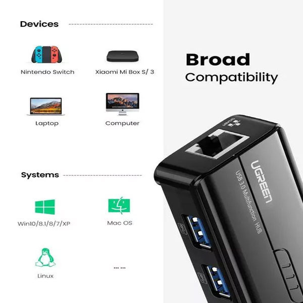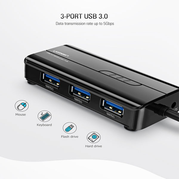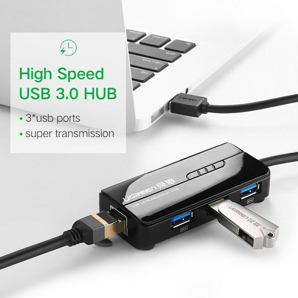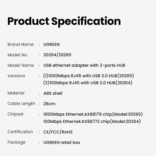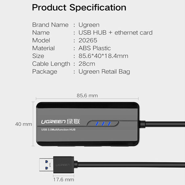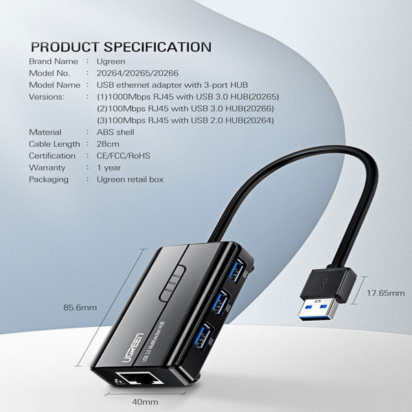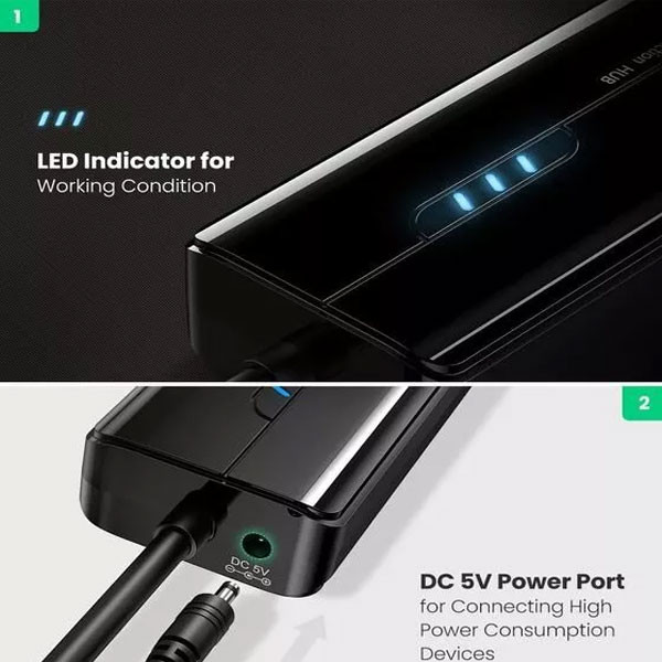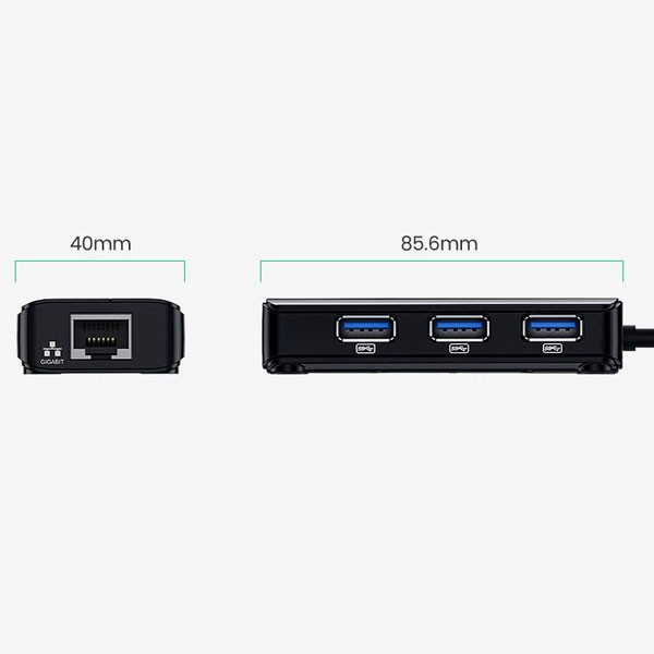 هاب «یوگرین» (Ugreen) مدل «CR103-20265» سه پورت دارد که مجهز به USB3.0 هستند و این ویژگی باعث میشود که در کوتاهترین زمان ممکن دستگاههای خود را شارژ کنید و نگرانی در این مورد نداشته باشید. در این محصول یک درگاه Ethernet نیز در نظر گرفته شده است که از سرعت بالای انتقال اطلاعات پشتیبانی میکند. انتقال اطلاعات نیز در این محصول با سرعت 5 گیگابایت بر ثانیه انجام می شود که میزان قابل توجهی است. البته این هاب ازقابلیت پشتیبانی از USB2.0 و USB1.1 نیز بهره می برد. پشتیبانی از استانداردهای IEEE 802.3, 802.3u و 802.3ab نیز از دیگر ویژگی های مهم این محصول است. این استانداردها به معنی پشتیبانی کامل CR103-20265 از ویژگی های Ethernet است. اگر به دنبال هاب با کیفیت برای شارژ و انتقال داده ها در 3 دستگاه با سرعت بالا هستید؛ هاب یوگرین مدل CR103-20265 را به عنوان یکی از گزینه های خود مدنظر قرار دهید.